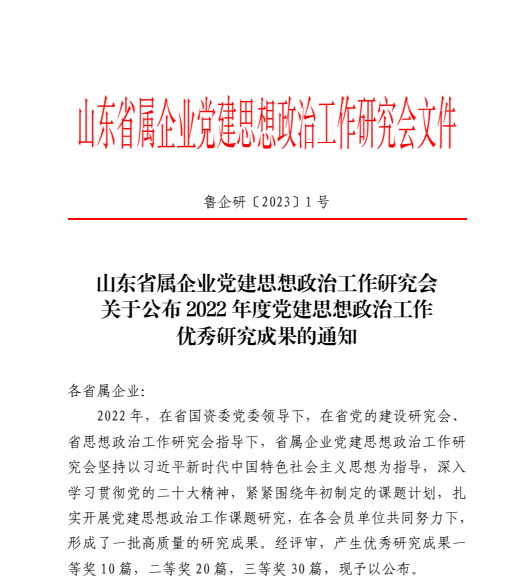 水發能源榮獲2022年度山東省屬企業黨建思想政治工作優秀研究成果三等獎